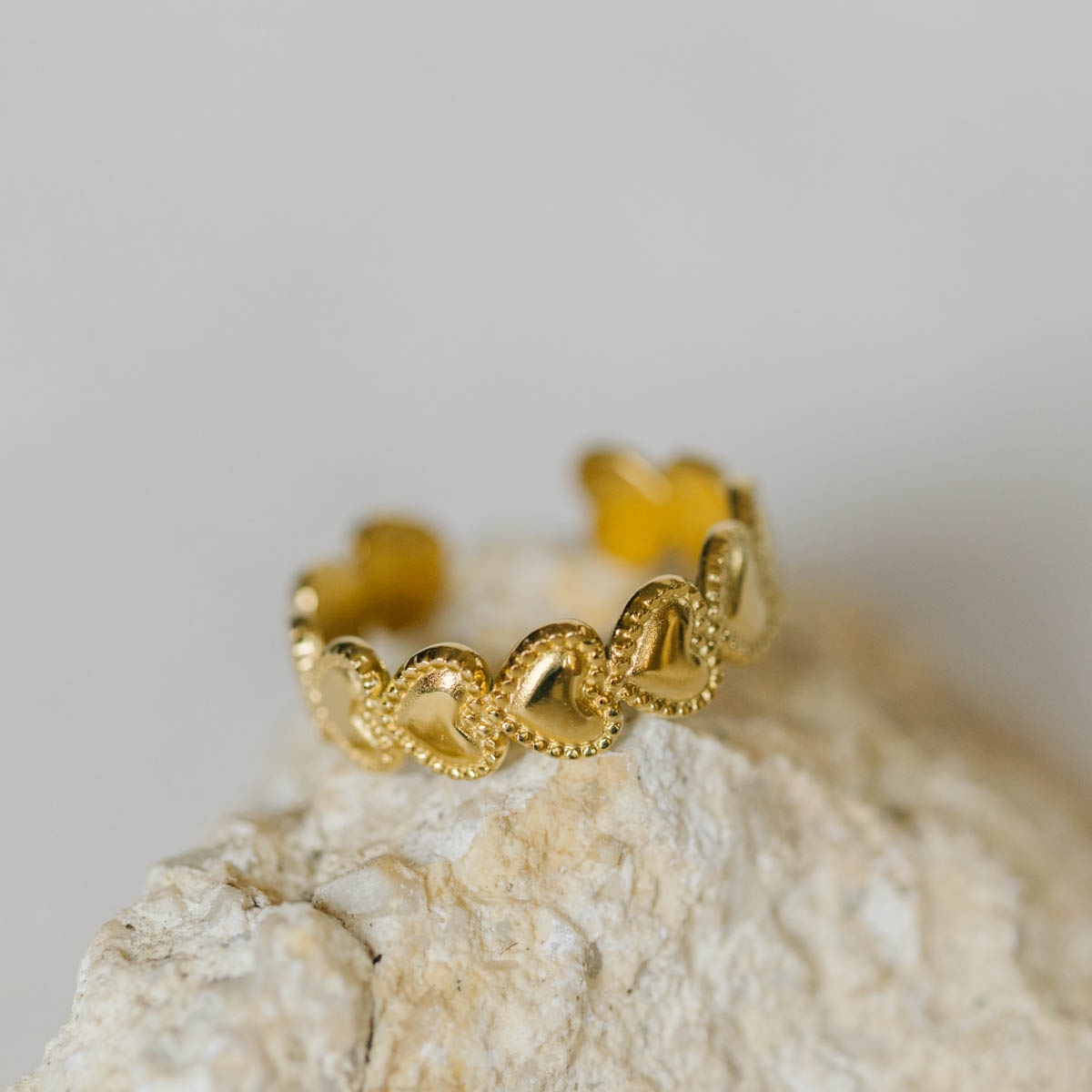 La bague "Amore" réunit une ligne de petits cœurs dorés finement perlés, inspirés des ex-voto et de leurs symboles de gratitude et de protection.