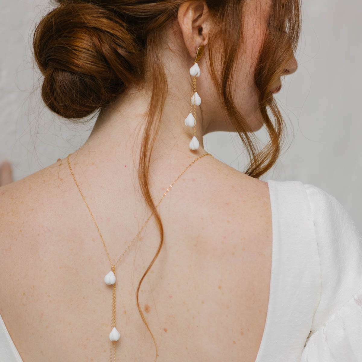 Les boucles d'oreilles "Paola" séduisent par leur mouvement fluide et leurs bourgeons de fleurs en porcelaine suspendus à deux chaînes dorées.