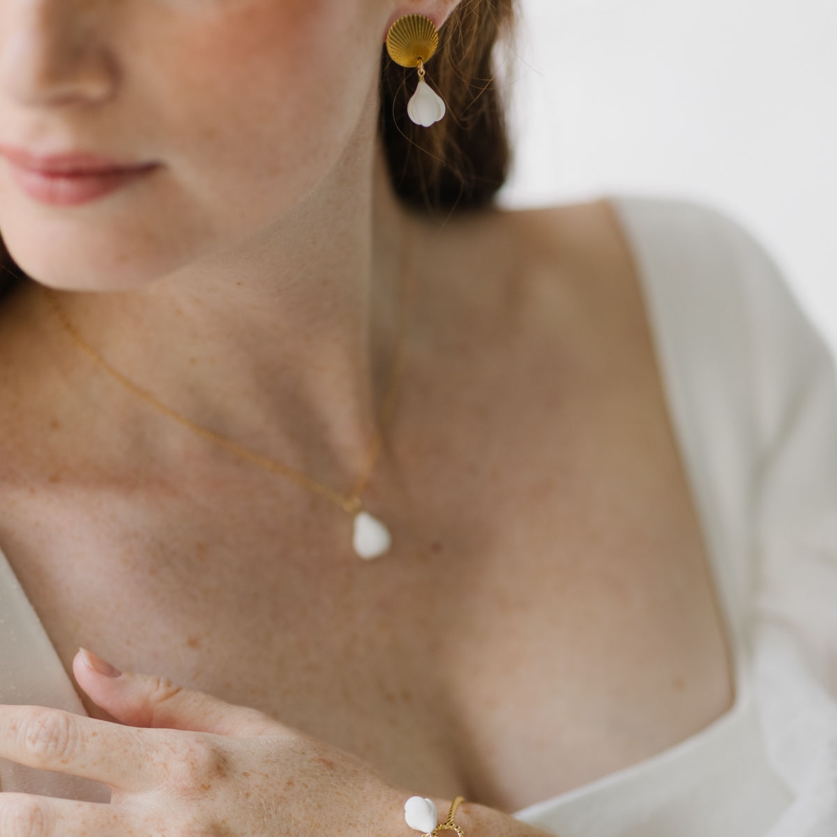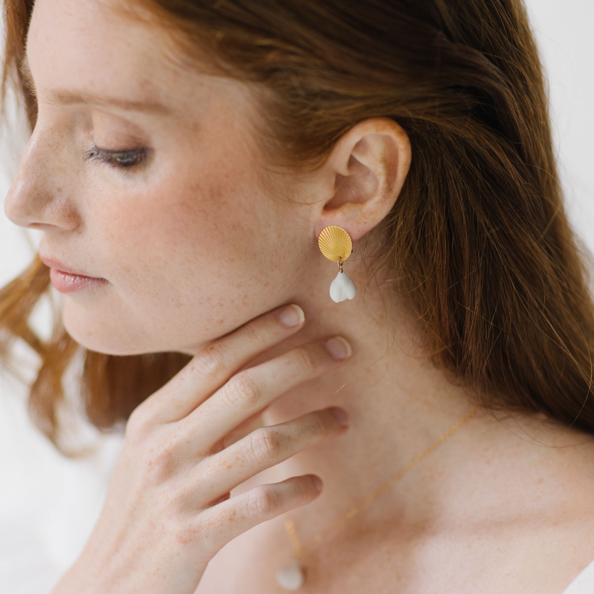 Leur base dorée en forme de clips soutient un petit bourgeon en porcelaine blanche façonné à la main.