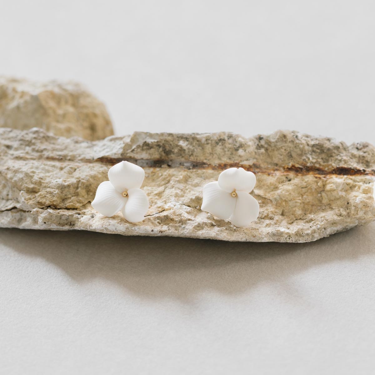 Leur fleur en porcelaine façonnée à la main, dévoile un cœur subtilement doré d'une petite perle.