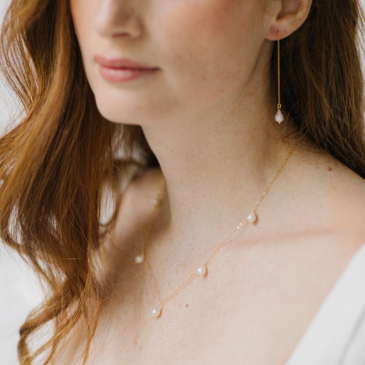 Une fine chaîne d'oreilles glisse délicatement le long du cou, se terminant par une perle d’eau douce en forme de goutte.