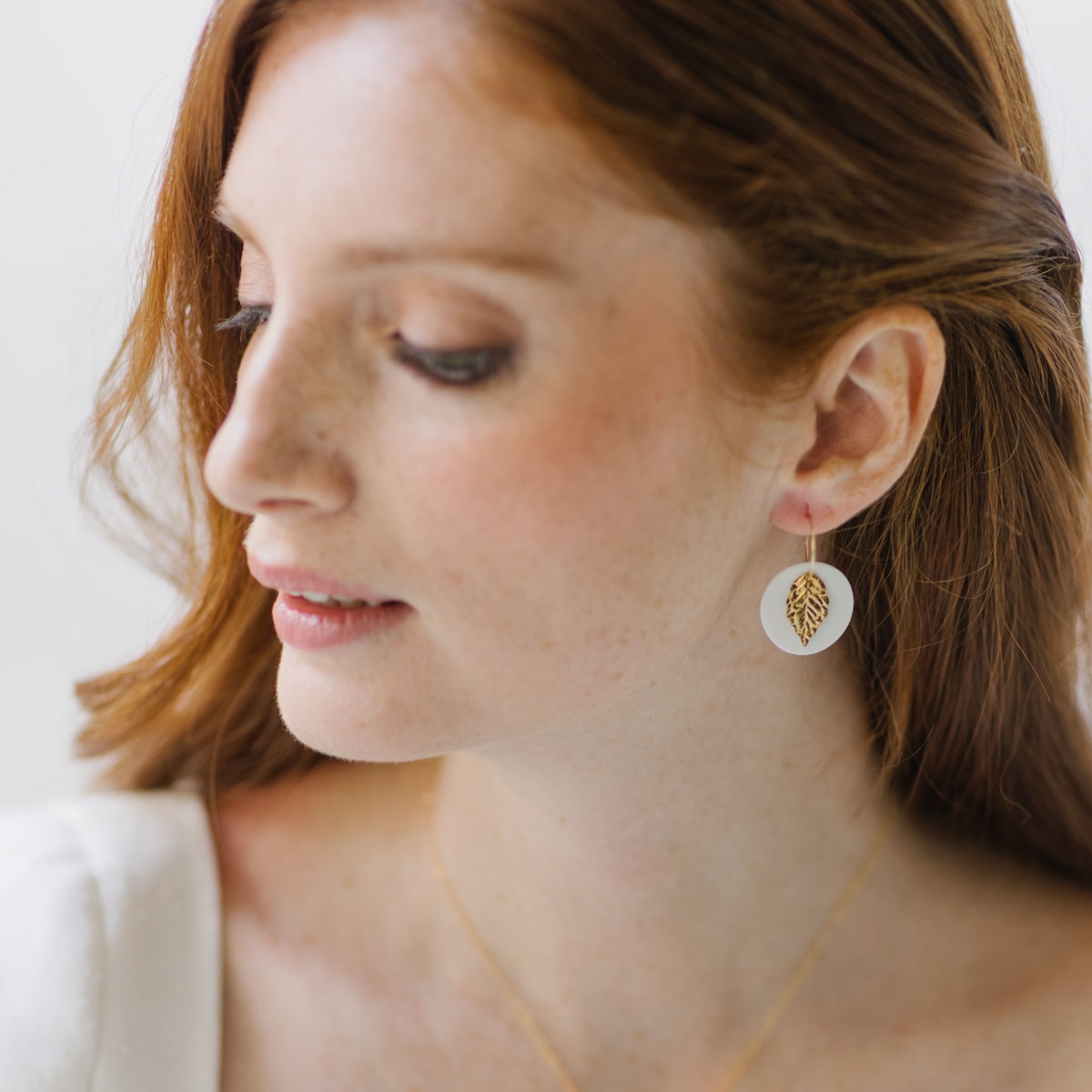 Créoles agrémentées d'un médaillon en porcelaine et d'une feuille dorée.