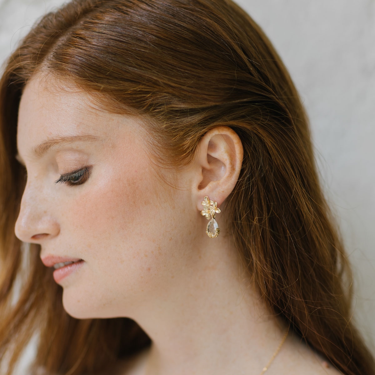 "Serena" Boucles d'oreilles de mariée avec fleurs dorées et goutte en verre