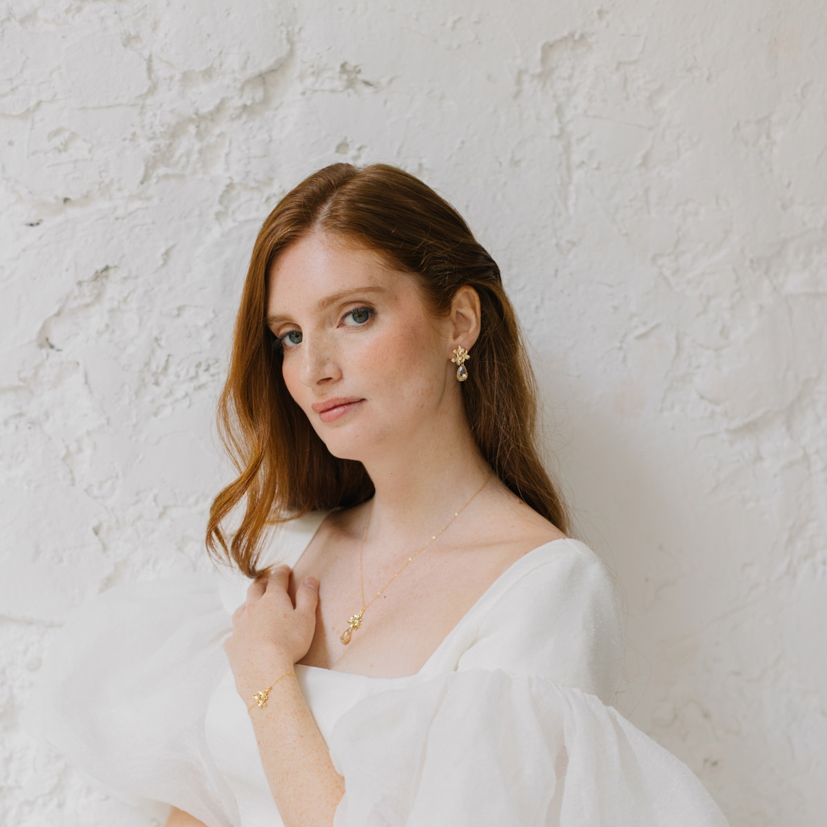 "Serena" Boucles d'oreilles de mariée avec fleurs dorées et goutte en verre