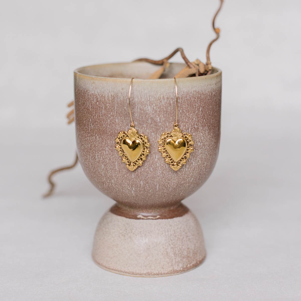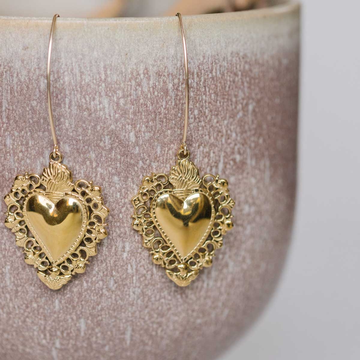 Inspirées des cœurs ex-voto, elles dévoilent un motif doré minutieusement détaillé, suspendu à crochet d'oreilles pour un mouvement délicat et gracieux.
