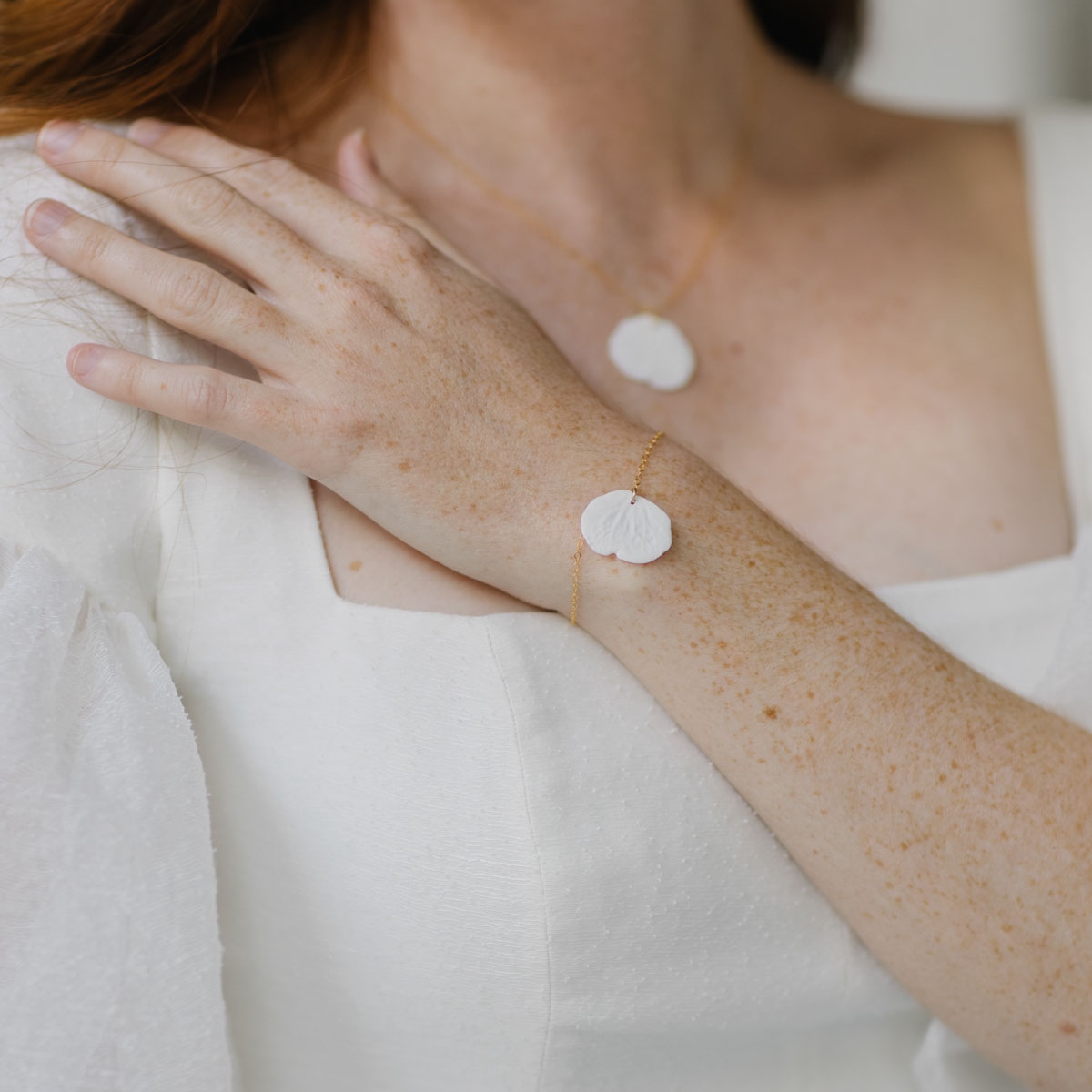 Le bracelet "Santina" séduit par son design avec sa feuille en porcelaine joliment texturée.