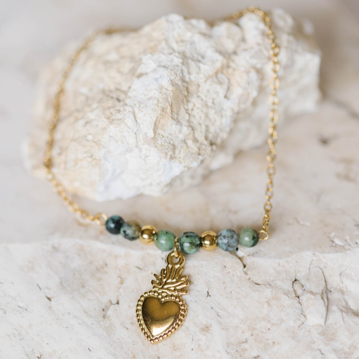 Le bracelet "Sérénité" associe la douceur de la turquoise africaine à l’éclat d’une délicate breloque cœur ex-voto doré personnalisable selon vos envies.
