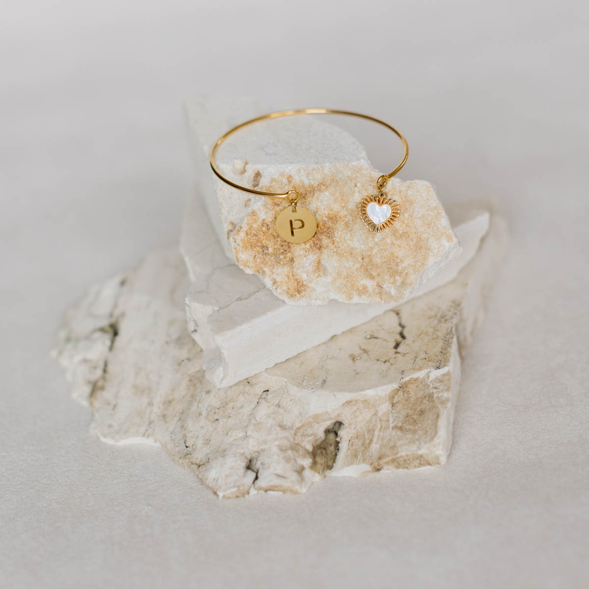 Le jonc doré "Cœur d’or" allie finesse et symbolique et s’orne d’un cœur doré et nacré ainsi que d’une initiale tous deux personnalisables, pour un bijou unique et plein de sens.