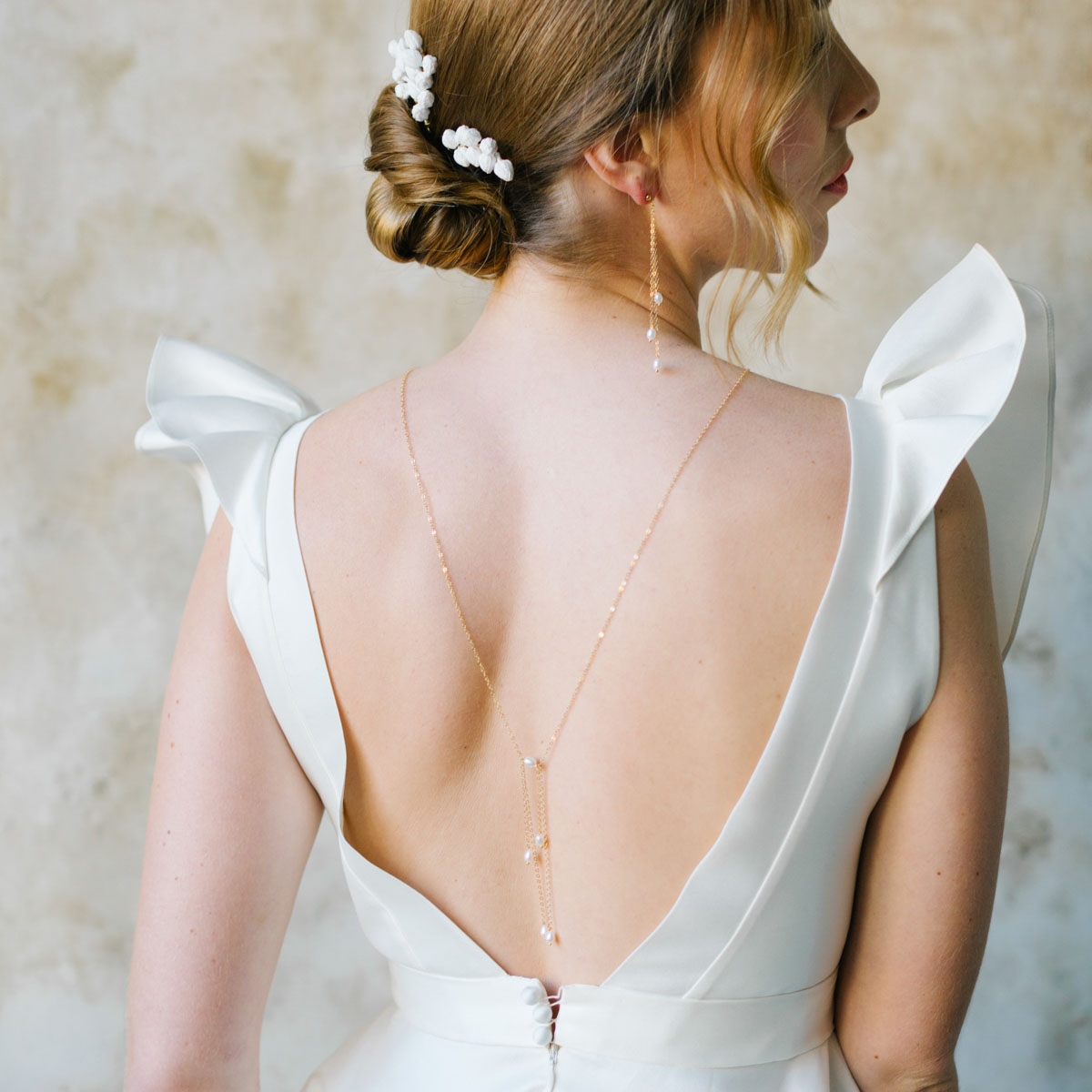 Ce collier bijou de dos au doux nom de Anita tombera à merveille dans le décolleté dos nu de votre robe.
