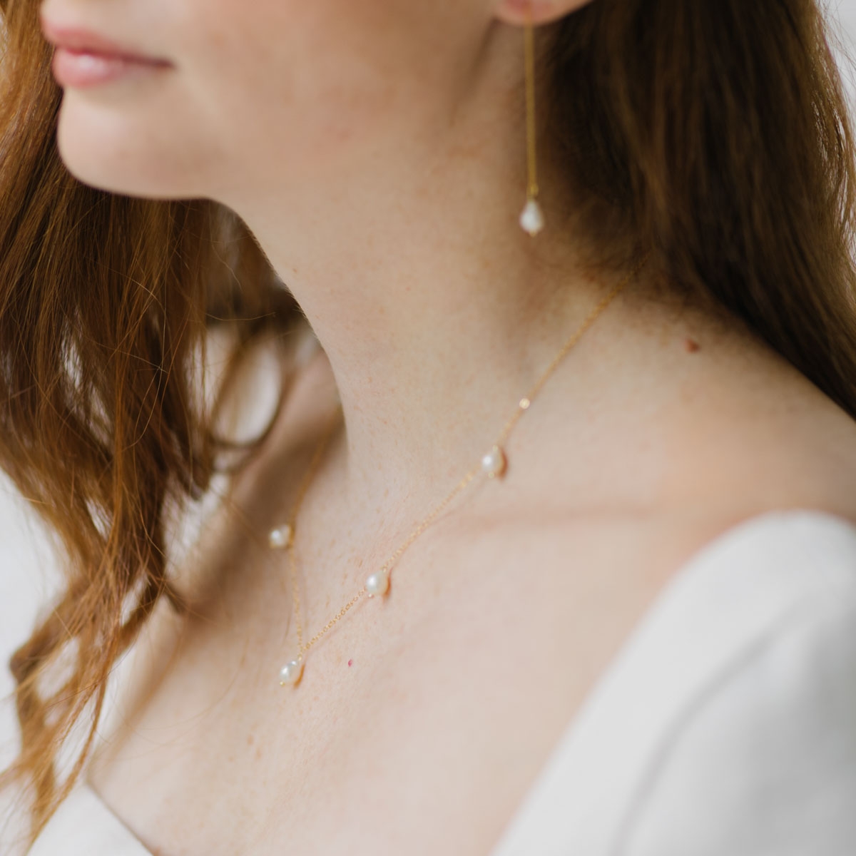 Composé de perles naturelles d’eau douce en forme de gouttes délicatement espacées sur une chaîne en gold filled ici, il reflète à la fois le raffinement et la simplicité.