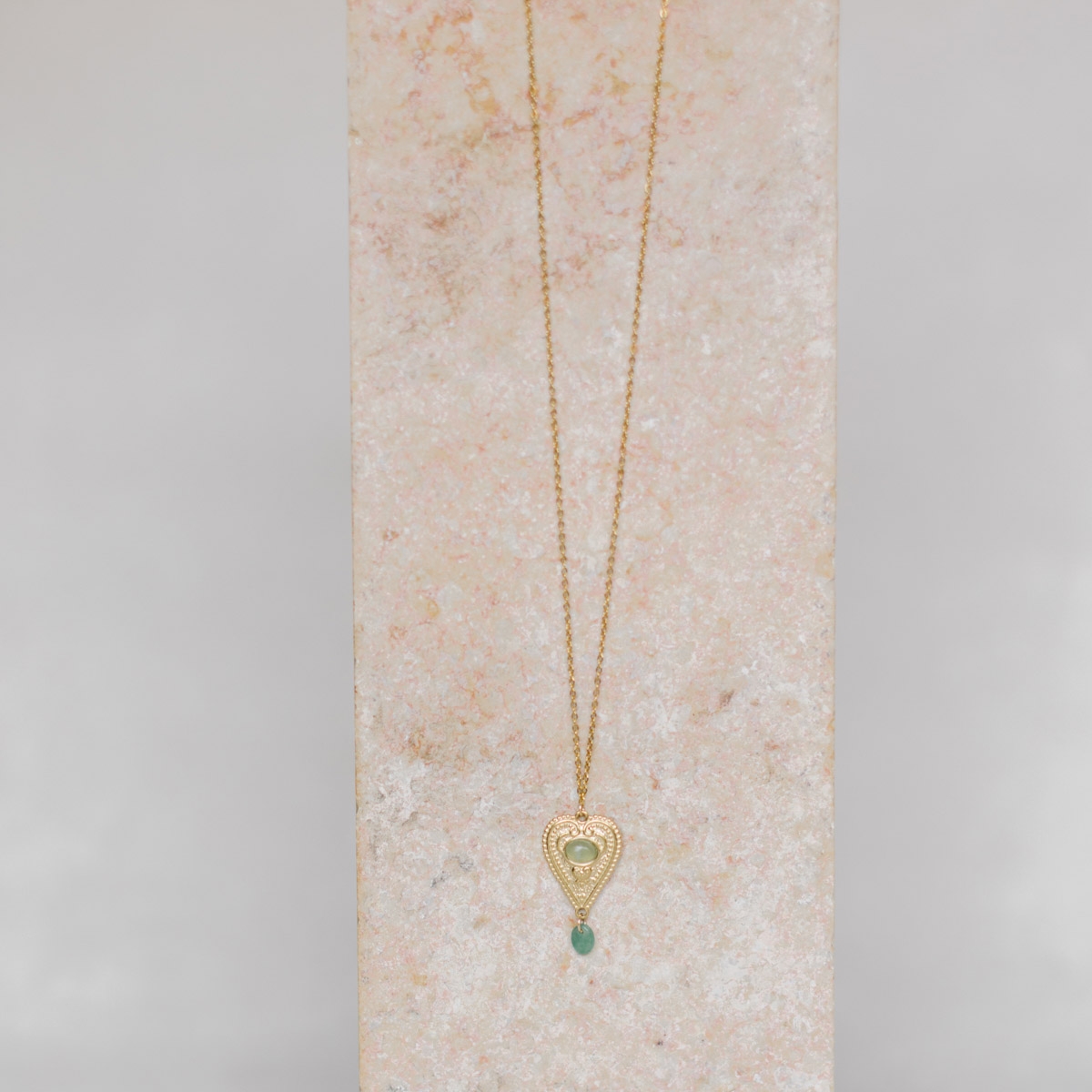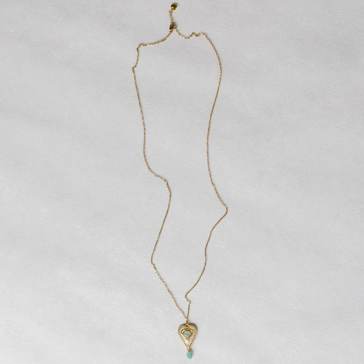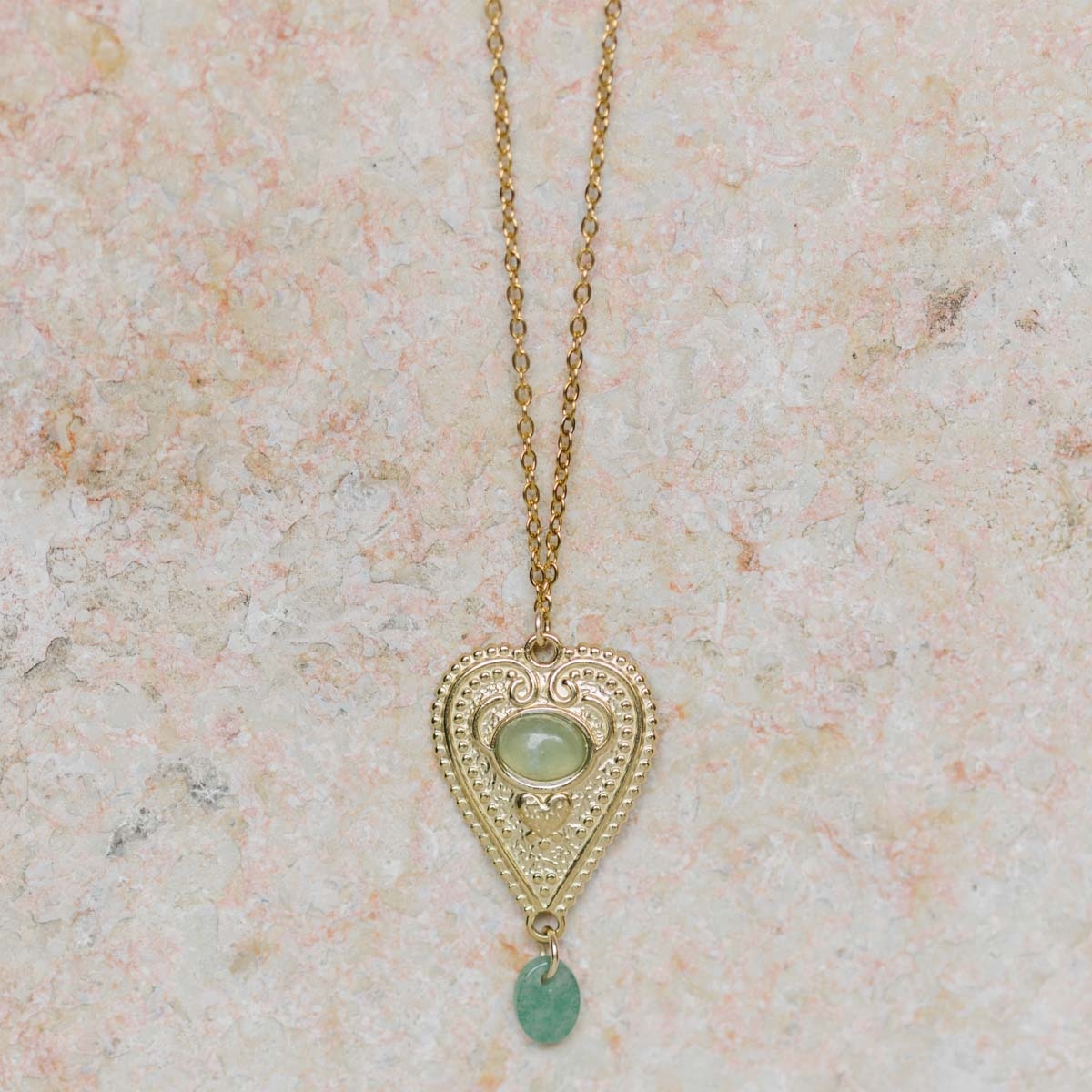 Son pendentif en forme de cœur délicatement ciselé, orné de pierres naturelles invite à la sérénité et à la confiance.