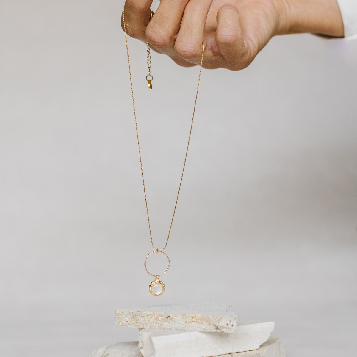 • Pendentif rond doré et nacre, cercle diamanté doré de 20 mm.