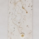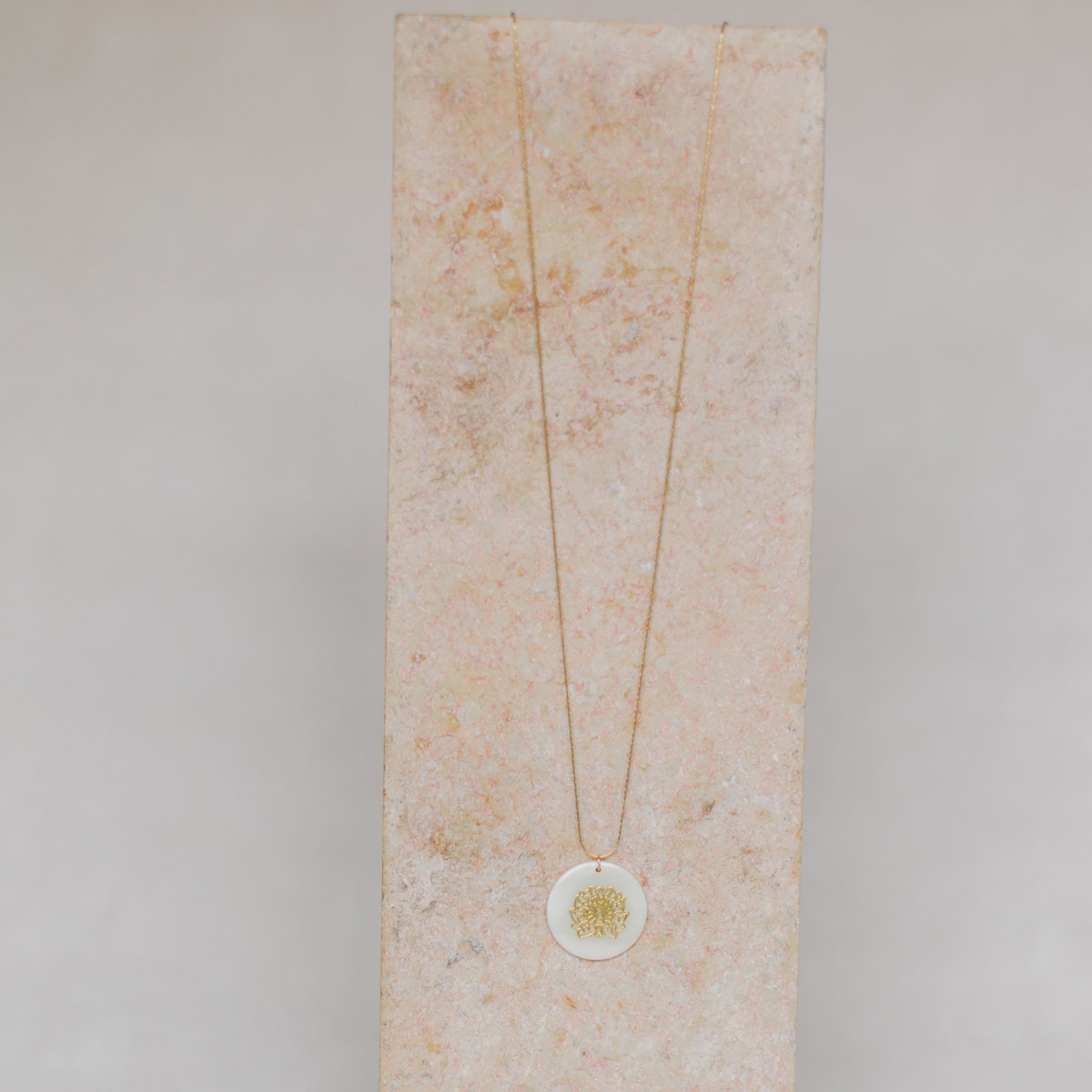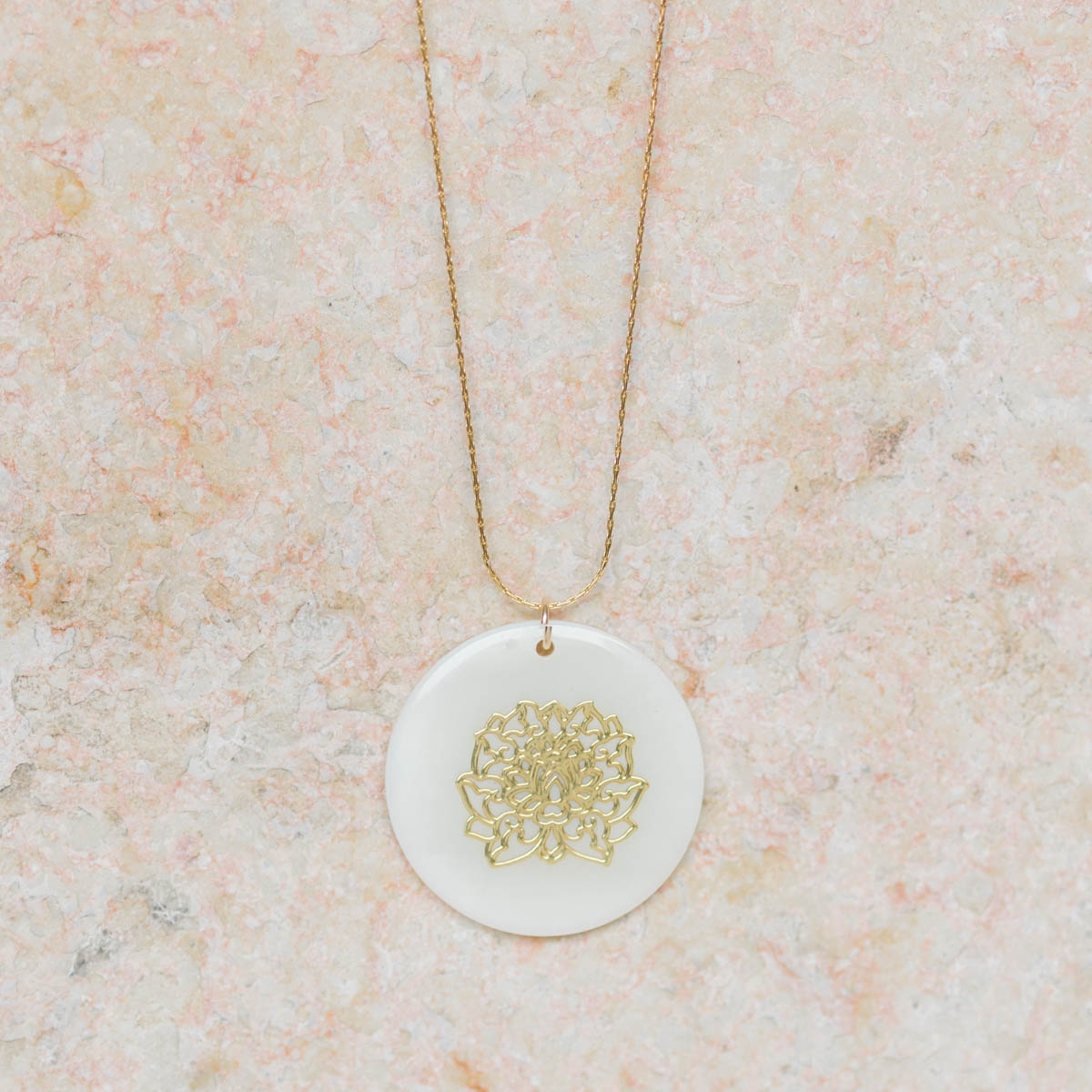 Sa longue chaîne fine en acier inoxydable doré porte un pendentif rond en nacre naturelle, orné d’un motif lotus doré à l’or fin (avec choix de chaînes plus courtes).