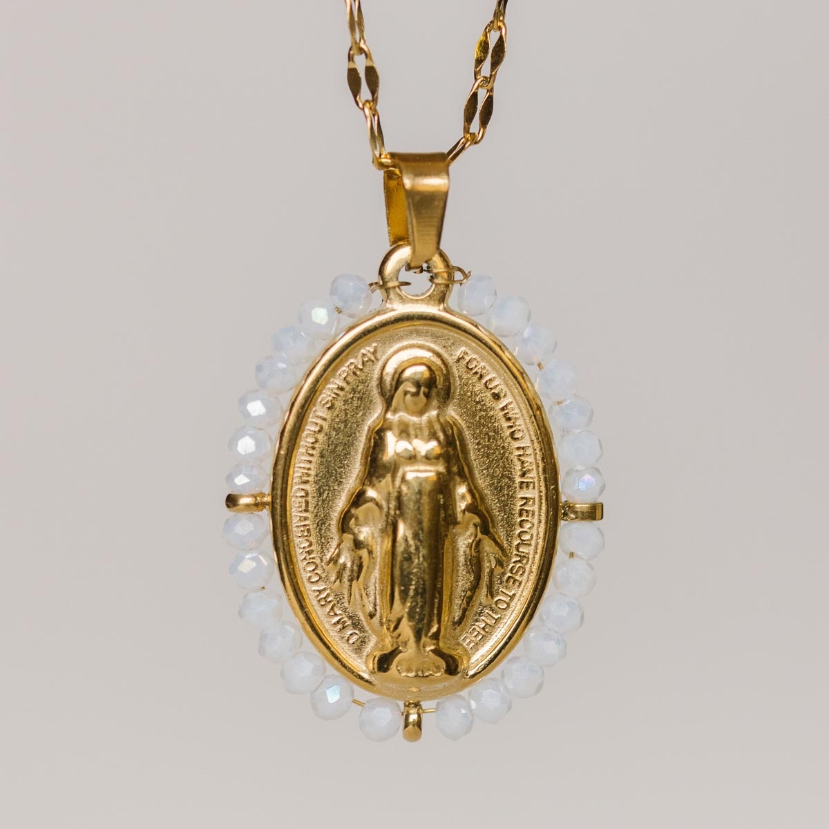 Son pendentif doré en forme de médaille ovale est délicatement entouré de petites perles blanches et révèle deux faces empreintes de sens : une Vierge aux détails fins, symbole de bienveillance et de paix, et au revers, un M entrelacé d’une croix, entouré de deux cœurs et de douze étoiles, représentant la lumière et la guidance.