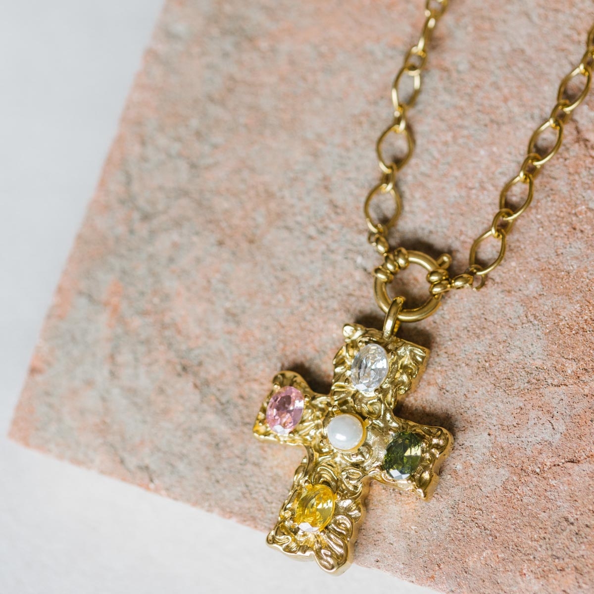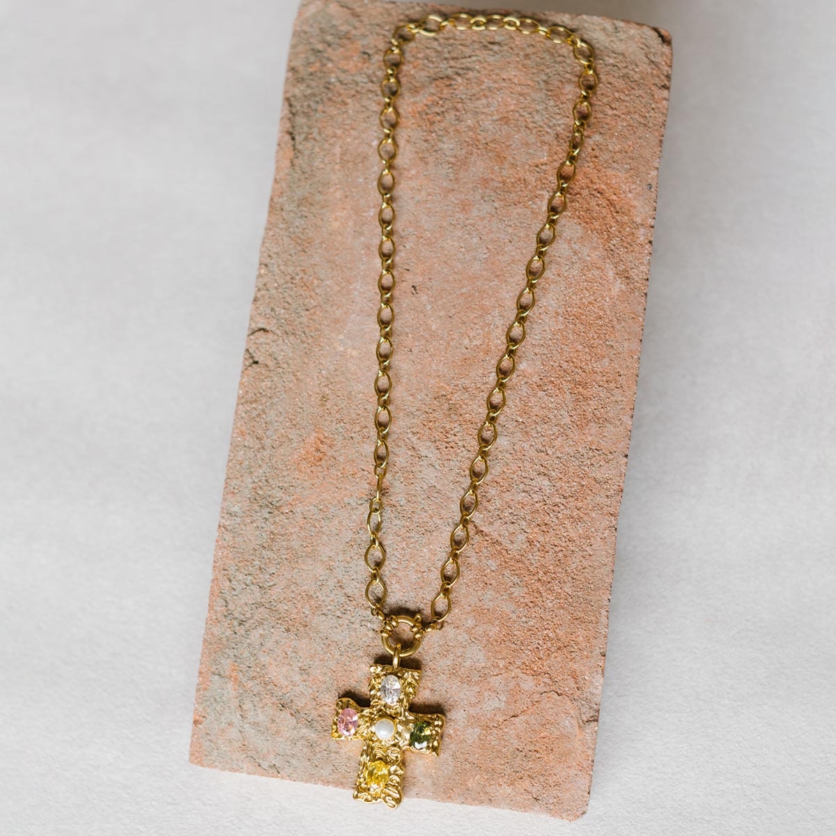 Sa chaîne en acier inoxydable doré, ornée d’un fermoir bouée sur l’avant, met en valeur une croix dorée sertie d'oxydes de zirconium colorés aux tons subtils et un cabochon nacré au centre.