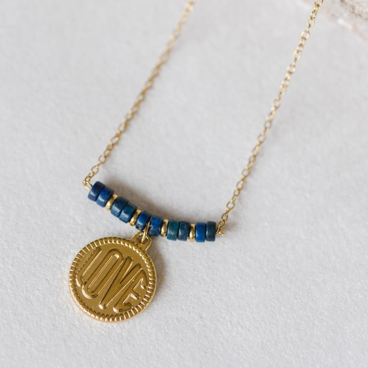 "Intuition" Collier doré avec perles heishi lapis-lazuli et médaille LOVE personnalisable