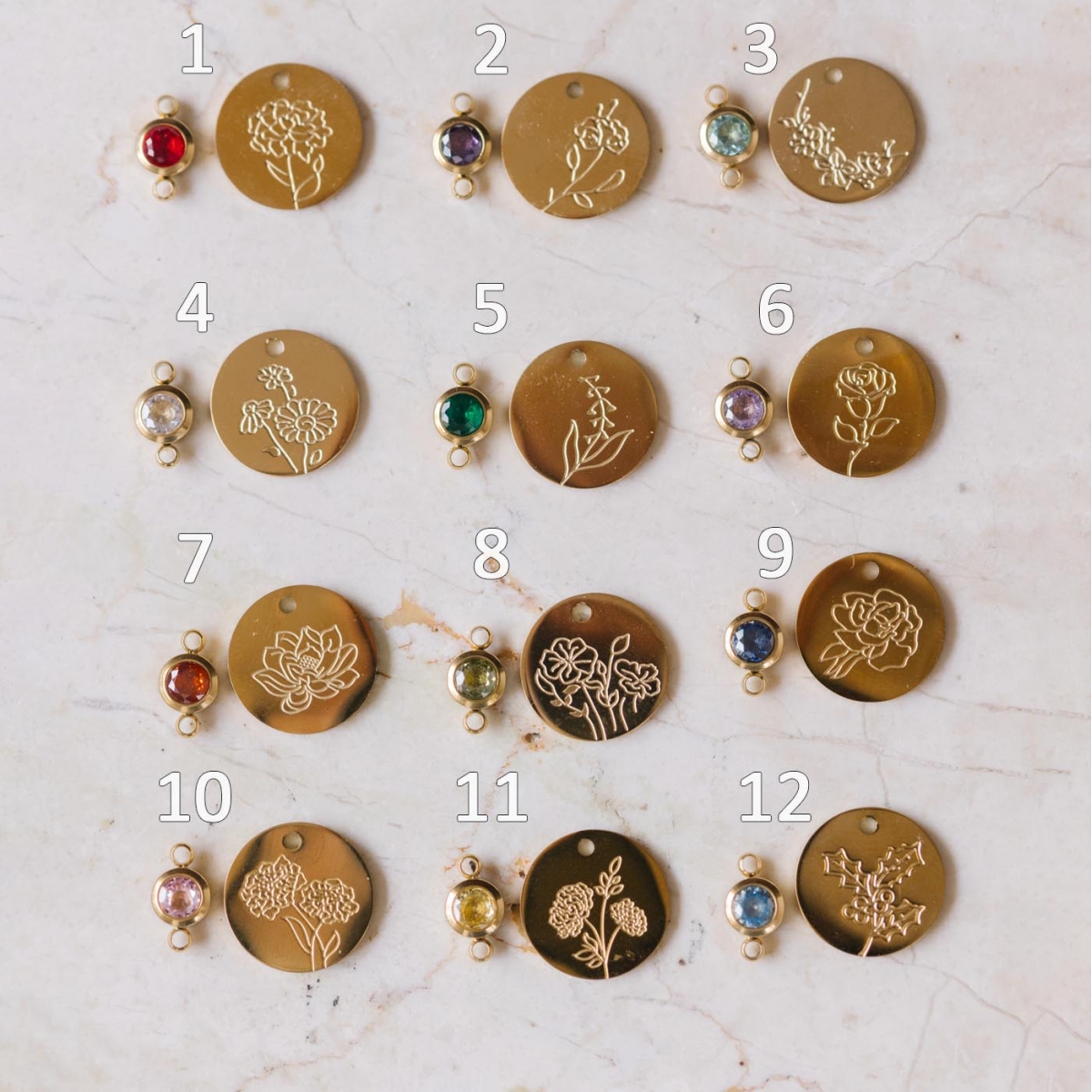 Chaque duo associe la fleur emblématique du mois et sa pierre naturelle, pour un bijou unique chargé d’intention.