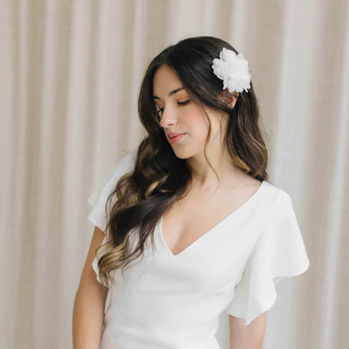 Composée de pétales vaporeux, cette fleur accessoirisera parfaitement une coiffure lâchée comme ici ou une coiffure plus relevée.