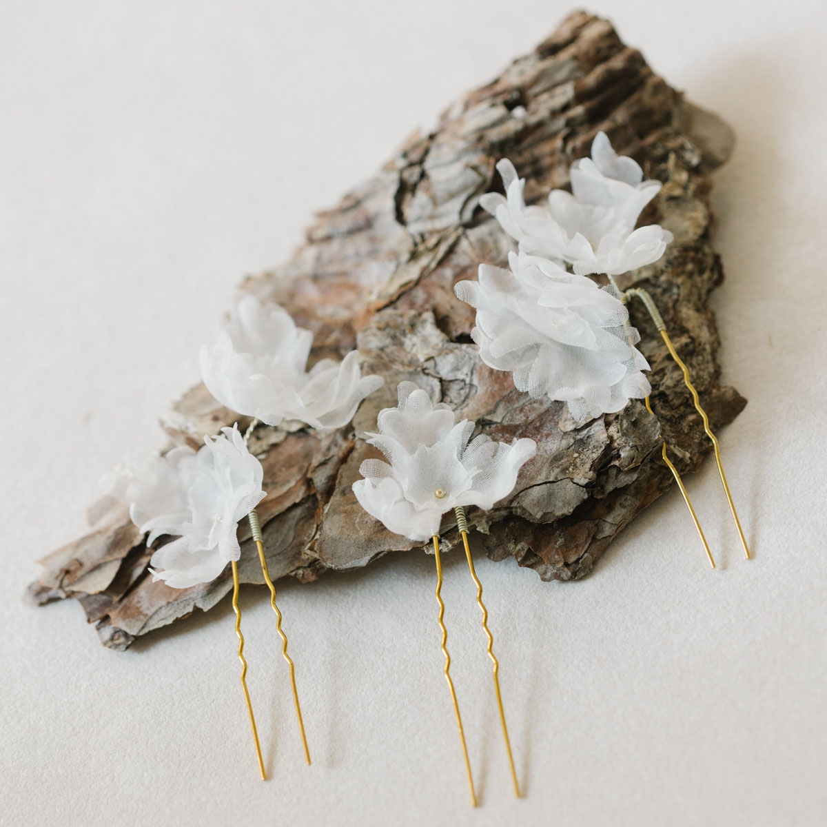 "Fiora" est un ensemble de pics à cheveux composés de fleurs en organza de soie, légères et aériennes.