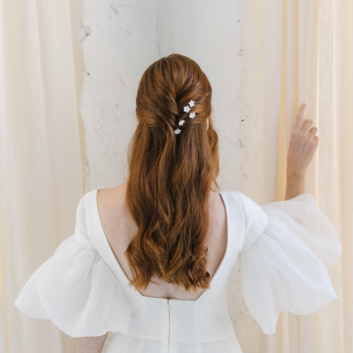 Ils se glissent facilement dans un chignon flou, une tresse ou une demi-attache, seuls ou associés à d’autres modèles comme les ornements "Victoria" ou le peigne "Diana" pour un rendu harmonieux et délicat.